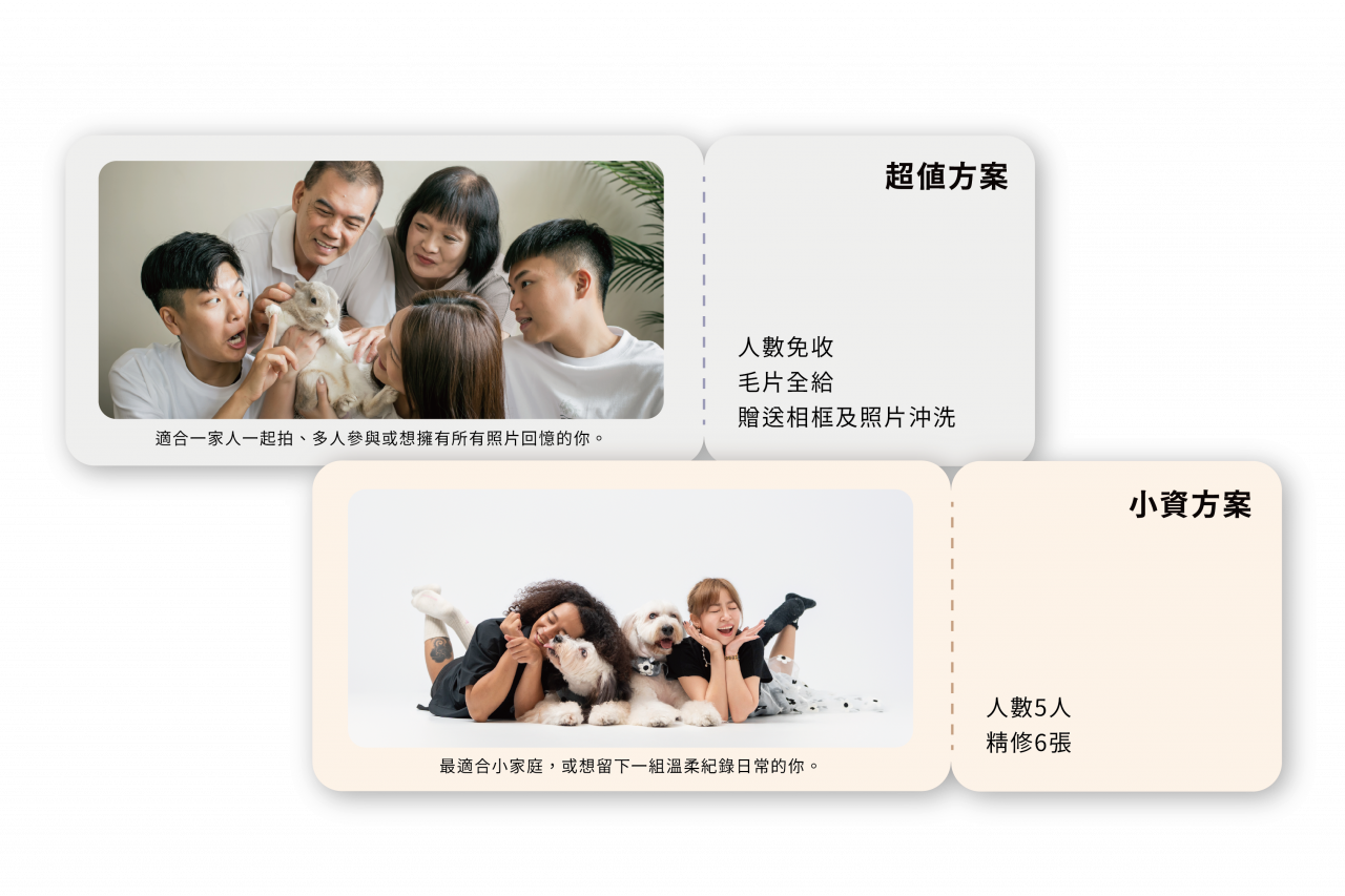 ▶ 服務時長:30-50分鐘。 ▶ 本方案含寵物共 5 位進場。 ▶ 本方案含 6 張修圖電子檔,不含毛片。 ▶ 休假日 / 國定假日加價1000元。 ▶ 預約時間為進場時間,其他拍攝事項請於訂單備註或右下角客服line@聯繫。 ▶ 本價格為授權使用作品集展示之優惠,若需保留隱私,可依原價購買。